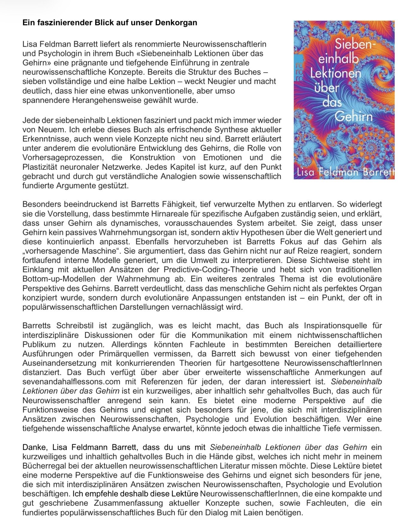 Siebeneinhalb Lektionen über das Gehirn (Feldmann Barrett, 2024)